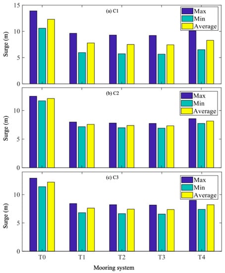 Surge movement maximum, minimum, and average values in (a) C1, (b) C2, and (c) C3.