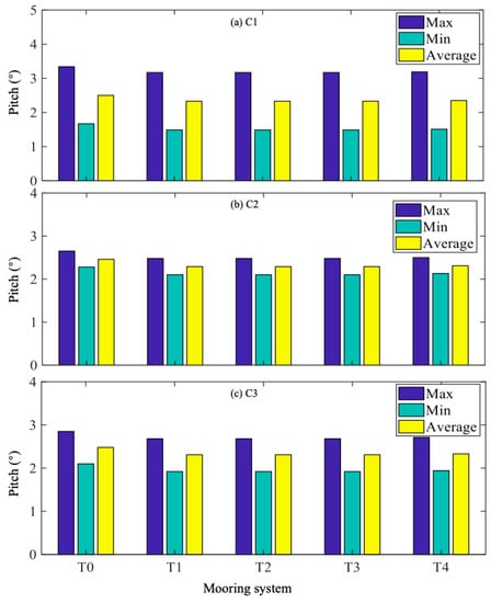 Figure 11 shows the wind turbine pitch movement maximum, minimum, and average values for T0–4 under C1–3. It can be seen that these statistic values of T0 were approximately 0.2° larger than those of T1–4, while they were almost at the same level for T1–4. In C1, the pitch movement maximum, minimum, and average values were respectively 3.34°, 1.67°, and 2.5°. They were 3.17°, 1.49°, and 2.33°, respectively, for T3. Meanwhile, they were 3.19°, 1.51°, and 2.35°, respectively, for T4. This quantitatively indicates that the developed mooring systems could only reduce wind turbine pitch movement by 6.8% when under regular waves. Although increasing the included angle could improve its performance, the pitch movement difference resulting from the included angle change was only 0.02° per 10°, which can be ignored because it is significantly smaller than the pitch movement average values.