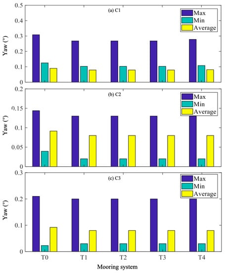 Figure 12 presents wind turbine yaw movement maximum, minimum, and average values for T0–4 under C1–3. The yaw movement maximum value of T0 was slightly larger than those of T1–4, while the yaw movement maximum values of T1–4 were almost the same. In C1, the yaw movement maximum value of T0 was 0.308°, and it was 0.27° for T3. This indicates that the optimal configuration for the developed mooring system (T3) could reduce wind turbine yaw movement by approximately 12.34%. Generally, the developed mooring system with three fairleads and 40° included angle performed better than that with six fairleads.