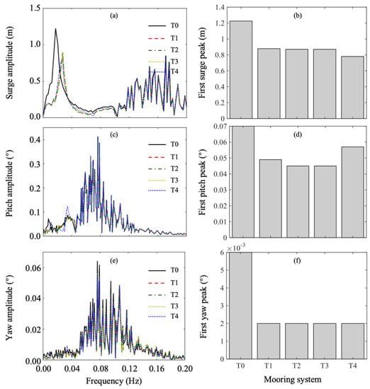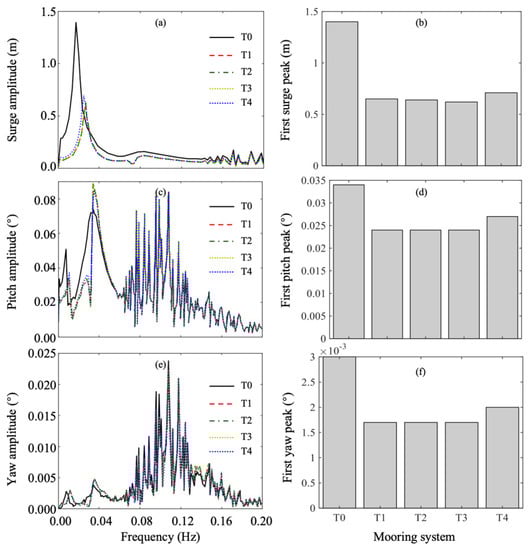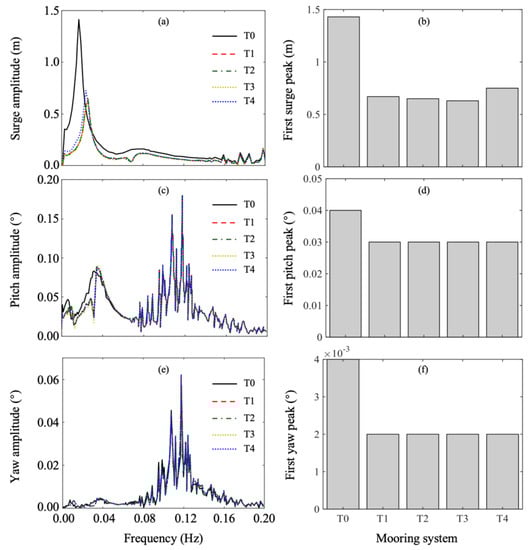 Figure 13, Figure 14 and Figure 15 present frequency−amplitude curves and first peak values on the frequency−amplitude curves of wind turbine surge, pitch, and yaw movement under C4–6. From the frequency−amplitude curves for surge movement, it can be observed that surge amplitudes for T0 were obviously larger than those with T1–4 within 0–0.02 Hz; the curves for T1–3 exhibited a small difference (approximately 0.05 m difference) from each other; and the curve for T4 was larger than that of T1. These indicate that the developed mooring system could effectively control the wind turbine surge movement when under irregular waves, and the maximum surge movement reduction occurred when using T3, with a reduction of 0.7 m. Compared with the six-fairlead mooring system, the mooring system with three fairleads and 40° included angle between two mooring lines in the same group performed better, which was similar to the observations in the regular wave results. As the included angle increased, the developed mooring system performed better and better. The first peak value for T3 reduced by 0.05 m compared with that for T1. In C4, the first peak values for T0, T3, and T4 were 1.43 m, 0.63 m, and 0.75 m, respectively. Hence, it can be said that the optimal mooring system configuration T3 could significantly reduce wind turbine surge movement by 56.08% when under irregular waves. The six-fairlead mooring system T4 could also reduce wind turbine surge movement by 47.55%, but it performed worse than T3 with 8.53% surge movement reduction difference between them.