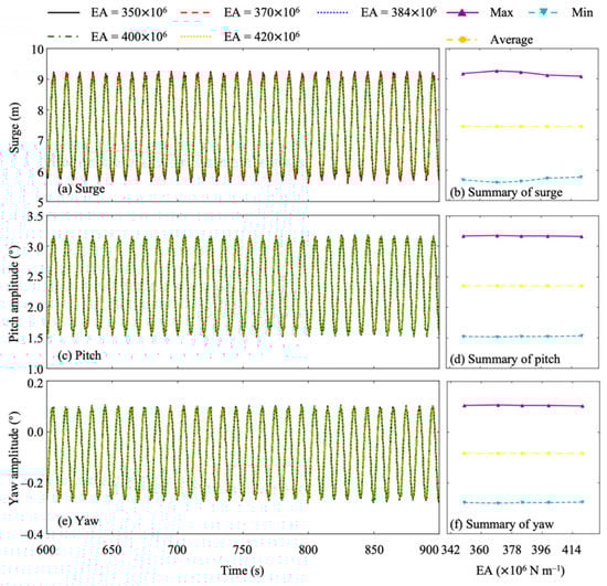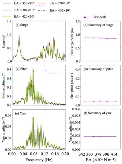 Wind turbine surge, pitch, and yaw movements with different mooring line stiffnesses when under irregular wave case C6: (a,b) surge movement; (c,d) pitch movement; (e,f) yaw movement.