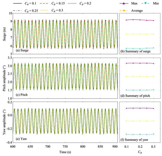 Figure 18 and Figure 19 show wind turbine movements with different static friction coefficients (CB) when under regular and irregular wave cases C1 and C6. From Figure 18 and Figure 19, it can be seen that as the static friction coefficient changed, the wind turbine movements exhibited little difference between them, similar to that of mooring line stiffness. In particular, the surge movement changed more obviously than the pitch and yaw movements, maybe resulting from the fact that the surge movement amplitude is larger than that of pitch and yaw. A possible explanation is that a spar-type floating wind turbine uses a gravity-based mooring system, which is moored mainly by mooring line gravity but not seabed friction force. Hence, seabed friction force contributes only a small portion of the total mooring system force. Further, the static friction coefficient has negligible effects on the wind turbine movements and the conclusions obtained before are generic for the different static friction coefficients.