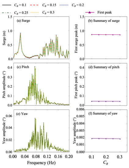 Frequency−amplitude curve and first peak amplitude in C4: (a) and (b) surge; (c) and (d) pitch; (e) and (f) yaw.
