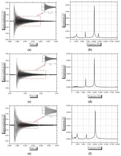 The part of the recorded signal considered for the assessment of the fundamental longitudinal frequency of vibration was selected after the initial response of the specimen to the impact load, akin to a transient part (Figure 2a,c,e) of the recorded response signal decay. This would ensure that any possible influence of reflected waves on the boundary of the specimen would be avoided and a cleaner signal would be recorded, similar to a steady-state response [20]. The influence of the initial, transient part on the response spectrum consisted of several peaks of comparable magnitude being identified. On the other hand, the steady state response resulted in a single dominant peak, as can be seen in Figure 2b,d,f.