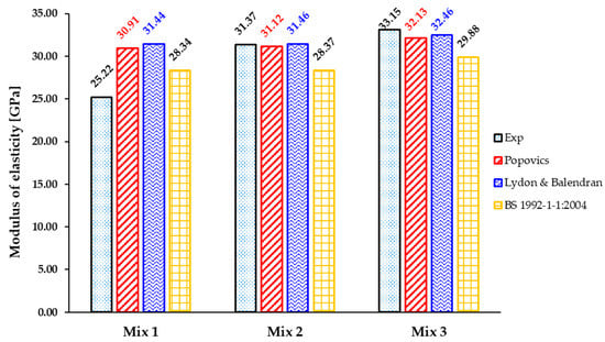 It can be observed that both Equations (6) and (7) give quite accurate results in terms of predicted value of the static modulus of elasticity for Mixes 2 and 3. All empirical prediction equations overestimated the experimental results of Mix 1 by 12.39–24.66%. Equation (8) underestimates the experimental results for Mixes 2 and 3 by 9.54% and 9.85%, respectively.