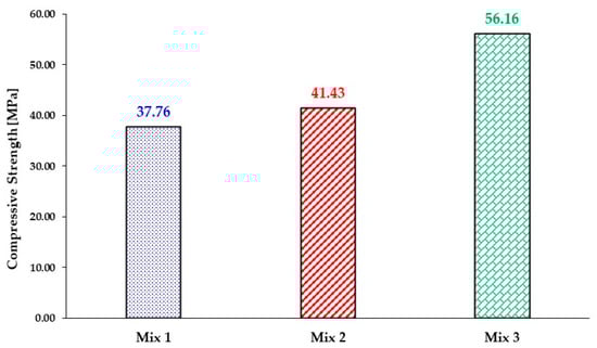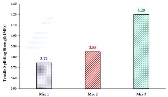 The tensile splitting strength was determined in five samples in accordance with SR EN 12390:6 [15]. The specimens were loaded at a loading rate of 0.05 MPa/s (0.4 kN/s). The obtained results are shown in Figure 6. The statistical analysis confirms the accuracy of the obtained results with values for COV of 10.71%, 9.1%, and 3.52% for Mix 1, Mix 2, and Mix 3, respectively.