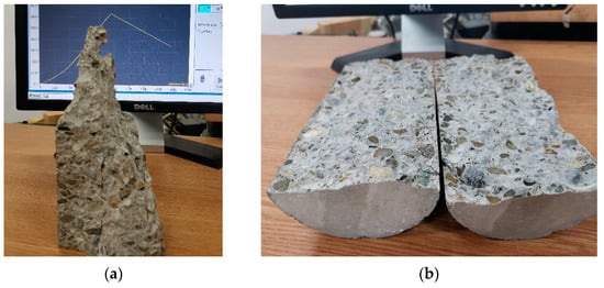 Samples of a failed specimen in both compression and tensile splitting are presented in Figure 7a,b, respectively. The formation of the hourglass shape for the specimen that failed in compression as well two resulting halves of the cylinder subjected to compression along the generatrix are proof of the consistency of the results presented in this paper.