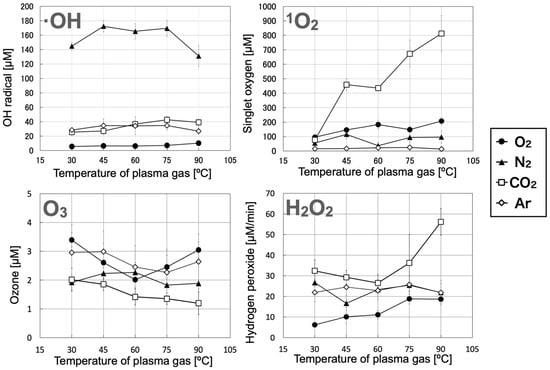 The relationship between the gas temperature of the plasma and the number of reactive species produced for each gas species is shown in Figure 2. The concentration of OH radicals was highest at approximately 130 µM or more in the nitrogen plasma and at 20–40 µM in the carbon dioxide and argon plasmas. The lowest concentration was detected in oxygen plasma at 10 µM or less. In the nitrogen plasma, the concentration of OH radicals increased from 146 to 172 µM with a change in the plasma gas temperature from 30 to 45 °C, showed an insignificant change from 45 to 75 °C, and decreased to 131 µM with a change in temperature from 75 to 90 °C. In the carbon dioxide plasma, the concentration increased from 26 to 39 µM with a change in the plasma gas temperature from 30 to 90 °C. In the argon plasma, the concentration increased from 28 to 34 µM with a change in the plasma gas temperature from 30 to 45 °C. There was almost no change in concentration when the plasma gas temperature increased from 45 to 75 °C, and the concentration decreased to 27 µM with a change in the plasma gas temperature from 75 to 90 °C. In the oxygen plasma, the concentration increased from 5.7 to 10 µM with a change in the plasma gas temperature from 30 to 90 °C.