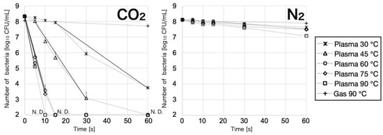 Figure 3 shows the relationship between the gas temperature and bactericidal effects of the carbon dioxide and nitrogen plasmas. At a gas temperature of 30 °C, the carbon dioxide plasma showed a bactericidal effect of more than a 4-log reduction in the number of surviving bacteria in 60 s. At a gas temperature of 45 °C, the carbon dioxide plasma demonstrated a bactericidal effect of more than a 6-log reduction in the number of surviving bacteria in 60 s. At gas temperatures of 60 and 75 °C, the carbon dioxide plasma showed a bactericidal effect of more than a 6-log reduction in the number of surviving bacteria in 15 s. At a gas temperature of 90 °C, the carbon dioxide plasma showed a bactericidal effect of more than a 6-log reduction in the number of surviving bacteria in 10 s. The increase in the gas temperature of the plasma significantly increased its bactericidal effect. In the case of the carbon dioxide gas treatment at 90 °C, the number of surviving bacteria did not decrease by 1-log even after 60 s of treatment. The maximum bactericidal effect of the nitrogen plasma was only approximately a 1-log reduction after 60 s of treatment, showing a significant difference from the bactericidal effect of the carbon dioxide plasma. No difference in its bactericidal effect was observed when the plasma gas temperature was varied from 30 to 75 °C. In the case of the nitrogen gas treatment at 90 °C, the number of surviving bacteria did not decrease by 1-log even after 60 s of treatment.