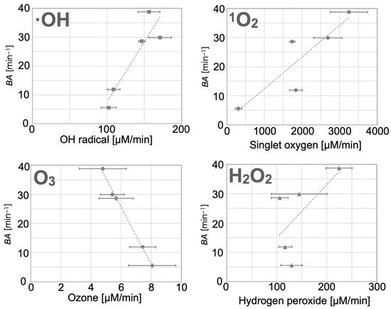 Correlation coefficient value (R) of BA values and reactive species.