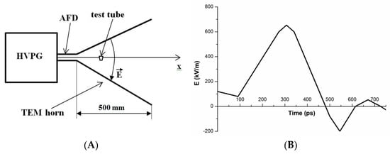 In the working area of the emitter, the intensity of the pulsed electric field was measured. The pulses were recorded with an IPPL-L converter (conversion factor 5.11 × 10−4 V/(V/m), transient characteristic rise-time 5 ps, transient characteristic duration 4.6 ns), and a stroboscopic oscillograph (50 GHz bandpass). Figure 1B displays an oscillogram of the ultra-short electromagnetic pulses recorded within the antenna mouth in the point, where the test tube—with the solution to be irradiated—was placed.