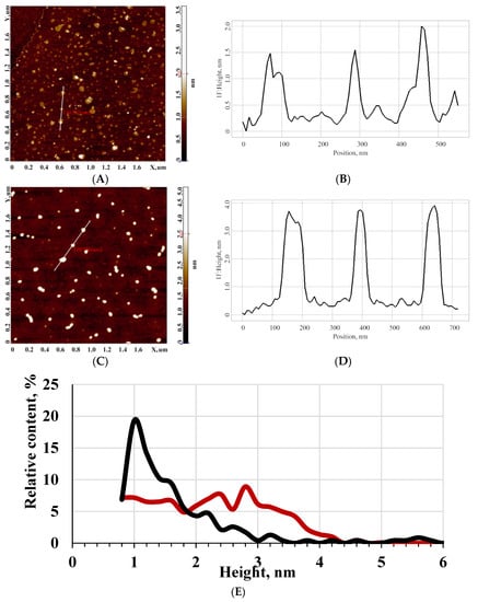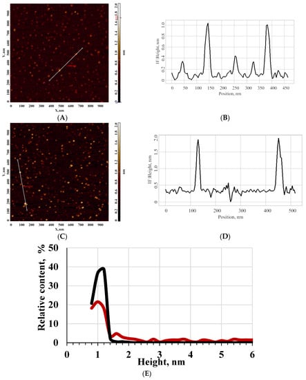 Panel (A) displays the image obtained in the control experiment. In this experiment, no electromagnetic impact on the analyzed enzyme solution was performed. As seen from Figure 3A,B, in the case of the absence of an electromagnetic field impact on the protein solution, it adsorbs onto the substrate surface in the form of compact objects, whose height makes up 1 to 2 nm. After processing the AFM data obtained, a distribution of the visualized objects with height ρ(h) was plotted. The ρ(h) distribution plot is shown in Figure 3E (black curve). The ρ(h) distribution curve indicates that the maximum number of the visualized objects have a height of about (1.0 ± 0.2) nm, while the width at half-height makes up 0.8 nm.