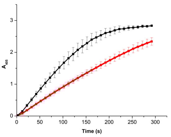 Results of spectrophotometry-based estimation of HRP enzymatic activity using a standard assay with ABTS. Typical time dependencies of the absorbance at 405 nm obtained for the HRP solution irradiated in PEMF (red curve), and for the control HRP solution (black curve). Experimental conditions: HRP:ABTS:H2O2 = 10−9 M:0.3 mM:2.5 mM. T = 23 °C.