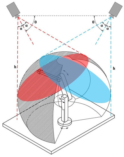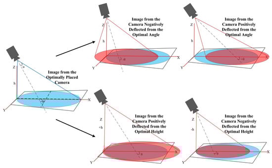 where is the one-half of the camera’s view angle, is the camera’s orientation angle concerning the x-axis, and h is the camera’s vertical position (Figure 4). The image formed on the camera sensor is rectangular. Therefore, the image outside the circular area is removed by masking in the program.