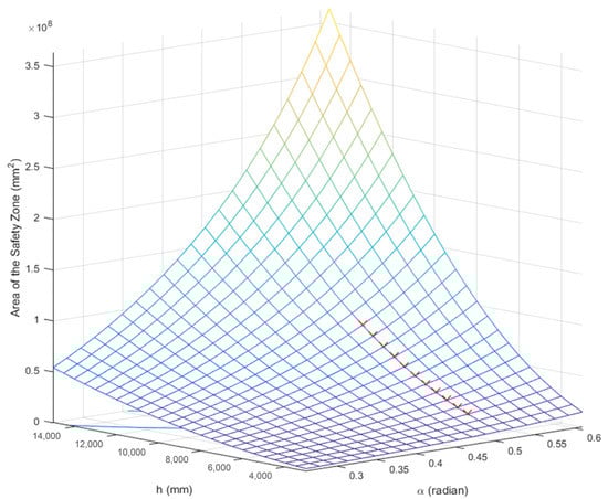 Figure 5 shows the graphical representation of the area that the objective function scans for the given constraints. In this graph, the area of the safety zone is directly proportional to and . Therefore, although the yellow area shown in Figure 6 has the highest area for the safety zone, it is seen that the optimal point should be sought in this region due to the height constraints. Therefore, the optimal region for the optimal angle of the camera lens and h height values between 4000 to 10,000 mm is marked in red color.