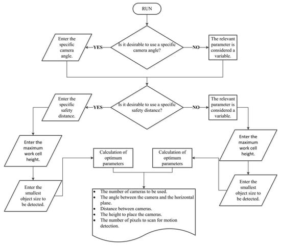A generic and dynamic mathematical model including all the critical variables is needed for the image-based safety system. This system model is expected to practically adapt to various cases and constraints in the industry. The camera lens angle and the minimum object size to detect are the main input variables, the safety distance may or may not be an independent variable based on dimensions of the work cell, and the maximum camera height is the main constraint. The flowchart of the dynamic model of the proposed safety system is given in Figure 6. This relatively simple but effective algorithm produces a list of system design parameters that include the number of cameras, placement (heights and relative distances) and angles of cameras, and the number of pixels to be scanned in the work cell.