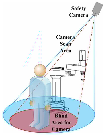 Fenceless robotic production systems have been emerging for a couple of decades, and they are still being developed. As these systems consist of work cells without any separators between robot workspaces and neighboring fields, some active precautions are necessary to achieve tasks and workers’ safety requirements. A fenceless and robot-assisted human-guided production system has significant advantages over full automated ones covered with fences. The most critical obstacle for a successful application in production is the inefficiency caused by the safety requirements [5]. Three-dimensional (3-D) cameras are the most common in image processing-based safety systems according to the current standards [6,7]. High-cost safety systems using a single 3-D camera have a significant disadvantage due to the lack of intervention in blind spots. A system using multiple low-cost, two-dimensional (2-D) cameras instead of a 3-D camera may solve this problem. However, it is crucial to make the most suitable choice for the cameras’ placements and orientations to scan a broader area eliminating blind spots.
