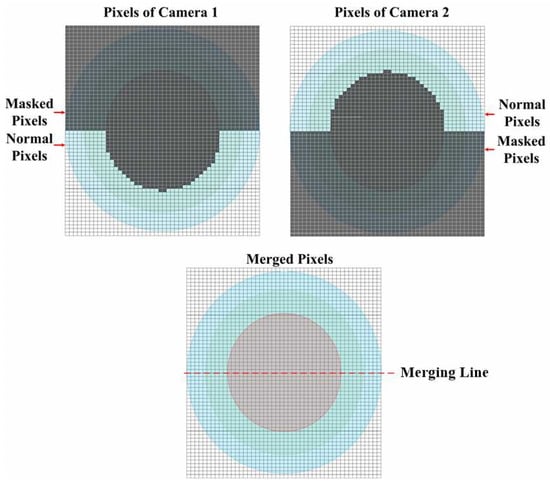 Another important criterion in combining multiple camera images is the formation of more than one image of an object entering the safety space when scanning the same regions. This creates complexity in determining the number of pixels to detect. The second criterion is that multiple scans of the same areas with image processing algorithms require an additional processing load for the control unit. Since the fastest possible reaction is essential for the safety system, the additional load on the controller will be disadvantageous. Considering these criteria, partial masking of the image taken from more than one camera was proposed. For each camera, the region where there is no blind spot was processed, and the masking of the outlying zone where the blind spot could occur was performed, and thus, blind spots were avoided. As a result, processing the same zones more than once was prevented. Compared with the image-combining algorithms in the literature, a unique method that can be integrated into the safety system and work more efficiently was used. Figure 8 shows a schematic of a circular work cell placed on the image pixels of a two-camera system. Partial masking was applied to the upper half of the images taken from Camera 1 and Camera 2. A single image was produced by combining unmasked partial images with no blind spots. Figure 9 shows a more detailed 3-D perspective schematic of the image stitching proposed. The mono image developed from the unmasked portions of multiple images is naturally not photo realistic, but it is sufficient to detect a foreign object penetrating the safety zones of a work cell. When three or more cameras are used, pie slice images at 120°, 90°, 72°, etc. can also be stitched similarly.