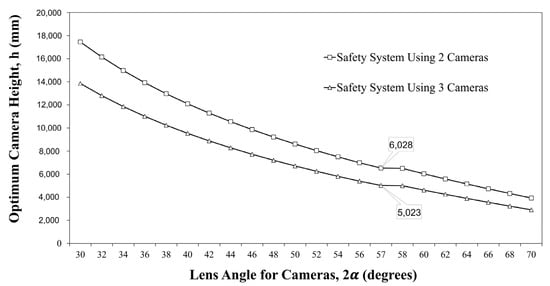 All calculated values of α and h provided for design constraints are given in Figure 13, which shows the heights to be placed according to different camera lens angles graphically. The graph in the figure contains two curves. One is “Camera Height for Safety System for 2 Cameras”, and the other one is “Camera Height for Safety System for 3 Cameras”. In the previous calculations, it is seen that the optimal camera lens angle is 57.874°. Therefore, it was calculated that the required height for the using two cameras system is 6028 mm, and the required height for the using three cameras system is 5023 mm. For cases in which the optimal camera angle is not desired to be used, the camera heights suitable for the lens angle of the existing camera are also shown in graphs. Three cameras were needed when two cameras were not enough (i.e., the camera height is larger than 10 m). In case of the need to use three cameras, the cameras were positioned as circular and equally spaced. If three cameras were used, the total projection area and the previous solution’s constraints would change. The new constraint (htan(2)) should be more than 6000 mm and less than 8000 mm.