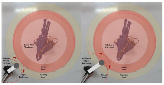 In this validation demo, a servo motor is preferred for controllable speed. During the driving of a servo motor performing the rotary motion, the software can determine how many degrees of rotation per second can be made. Using the motor driver software’s temporal change, a controlled movement can be achieved for the object at the desired speed. Thus, it is necessary to place an object at a certain distance from the motor drive shaft center. When the robot arm is placed on the border of the control area for this object’s movement, the foreign object is allowed to enter the control area at the desired speed. For this purpose, a servo motor driven foreign object system was established, as shown in Figure 15. The controlled objects entering the warning and alarm zones and their movement trajectories are shown in the left and right images of Figure 15, respectively.