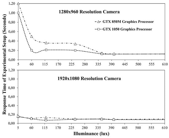 The plots above and below in Figure 17 are derived from the safety systems using low and high-resolution cameras, respectively. In both plots, the performance of two different graphics cards, including NVIDIA Geforce GTX 850 M and a GTX 1050, were compared. GTX 1050 is reported to have approximately 60% higher performance than GTX 850 M according to benchmark tests. The graphics processor did not appear to impact system response times at high illumination levels significantly. At the same time, the same experiments were carried out with cameras with two different resolutions in the graphics shown in the figure. Camera resolution appeared to have a high impact on system response at different illuminance levels. As seen from this graph, the minimum brightness of the camera to detect a foreign object was 5 lux. At this level, the detection time was at the highest level. The low-resolution camera showed that the detection time became shorter, and the performance increased as the illumination rose to 120 lux. The fluctuation seen after this level was related to the stability of the system itself. In terms of illuminance, the lowest level available was 120 lux. The high-resolution camera observed that the system worked stably even at low illumination levels.