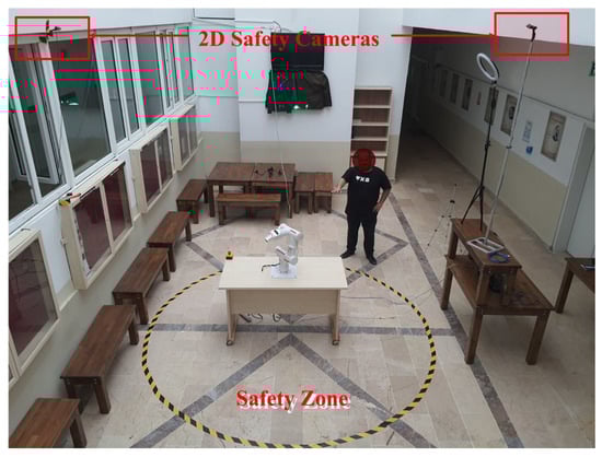 There are many commercially developed safety systems for work cells using industrial robot arms. These can be classified into sensor- and camera-based systems. Sensor-based ones are mostly preferred in simpler and controlled industrial environments because of disruptive factors such as industrial ambient noise that affects measurements’ sensitivity and accuracy. These effects are also valid for camera-based safety systems. Developing camera-based safety systems with software technology has a considerable advantage of supporting flexibility in production. Consequently, various camera image-based safety systems are available in the industry [15]. Considering that camera technology is developing day by day, it is predicted that it will be a more practical and widely used choice in the future, as compared with sensor-based safety systems [16].