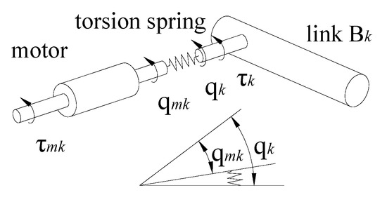 According to Spong’s assumption [20], the flexible coupling between the rotor of the drive motor mounted at joint and the link can be simplified to a linear torsion spring without inertia, taking its stiffness factor as a constant value. When the motor rotor turns through angle , the actual angle of rotation of the driven link is due to the torsion spring elastic force. Therefore, the elastic force between the motor rotor and the link is . The flexible joint structure is shown in Figure 2.