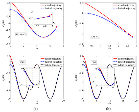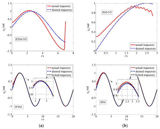 Trajectory tracking curve of the fully flexible space robot, 1 joint under two controls. (a) IFSM, (b) ISM.