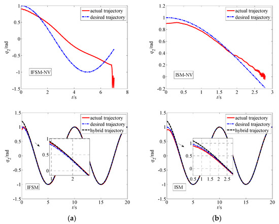 Trajectory tracking curve of the fully flexible space robot, 2 joint under two controls. (a) IFSM, (b) ISM.