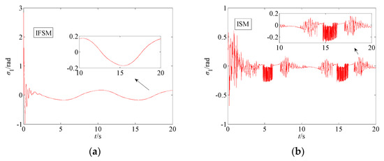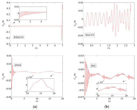 The first mode coordinates of the flexible link B1 under two controls. (a) IFSM, (b) ISM.