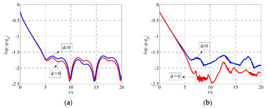 From Figure 13a, it can be seen that the total error convergence rate of the fully flexible space robot base, links and joint is within [−2.5, −1.6], when no external perturbation d is considered under the IFSM controller condition, and within [−2.5, −1.6] when the effect of the perturbation d is considered, the disturbance d can hardly affect the system control accuracy under IFSM control. From Figure 13b, it can be seen that the total error convergence rate of the fully flexible space robot base, links and joints is within [−1.7, −1.6] when the external disturbance d is not considered under the ISM controller condition; when the effect of the disturbance d is considered, the error convergence rate is within [−1.5, −2] and the control accuracy is significantly reduced, the disturbance d significantly degrades the system control accuracy under ISM control. The simulation results show that the IFSM controller is robust to external disturbances.