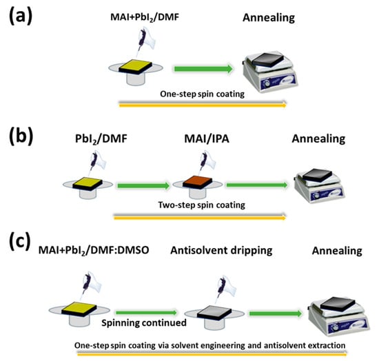 While the organic halide (e.g., methylammonium iodide (MAI)) component of the perovskite dissolves readily in virtually all polar solvents, finding a solvent to dissolve the metal halide (e.g., lead iodide (PbI2)) component is more difficult. Some of the widely used solvents include N,N-dimethylformamide (DMF) and dimethylsulfoxide (DMSO), and the solubility limit of PbI2 has been experimentally determined to be ~450 mg/mL and ~600 mg/mL in DMF and DMSO, respectively, which is sufficient to form an adequately thick perovskite film [,]. Over the years, several distinct variants of solution-processing by spin coating of perovskite materials have been studied. Such approaches have the common goal to produce perovskite films with dense and homogeneous morphology and large grain size and to achieve optimal crystallinity to yield an effective photoabsorber layer within the photovoltaic solar cell stack. The so-called one-step, two-step, and solvent engineering procedures are the most popular (Figure 1). Using the one-step method, 3D perovskite (e.g., MAPbI3) can be readily formed by spin coating the mixture of perovskite precursors (e.g., MAI and PbI2) in some polar aprotic solvents, such as N,N-dimethylacetamide (DMAc) and DMF. After spin coating, films can be thermally treated at mild temperatures to form the desired perovskite phase []. While this method is straightforward and remains widely used for some perovskite compositions [,], the perovskite precursors may undergo chemical reactions in the solution that affect the final film structure and composition, with a concomitant impact on the solar cell performance []. The two-step method, in which one of the precursors is deposited first, followed by the deposition of a second precursor and thermal annealing, was popular in the early days of perovskite research []. Most commonly, the first precursor (e.g., PbI2) is deposited by spin coating, while the second one (e.g., MAI) can be deposited by dipping the sample into a solution [] or by spin coating on top of the first layer []. For a time, devices fabricated using the two-step method performed better than those made using the one-step approach [], but the situation drastically changed with the advent of the solvent engineering approach [], which remains the most commonly used method to date.