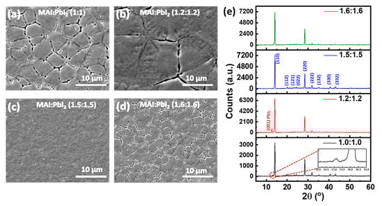 The SEM images of the perovskite films fabricated on glass substrates using different equimolar concentrations of MAI:PbI2: (a) (1.0:1.0), (b) (1.2:1.2), (c) (1.5:1.5), and (d) (1.6:1.6). (e) XRD spectra of the perovskite films synthesized on glass substrates at the increasing equimolar ratios of MAI:PbI2 from bottom-to-top. Inset in the bottom panel shows the magnified region in XRD spectra for (1.0:1.0) film at 13.14° ascribed to the PbI2 peak.