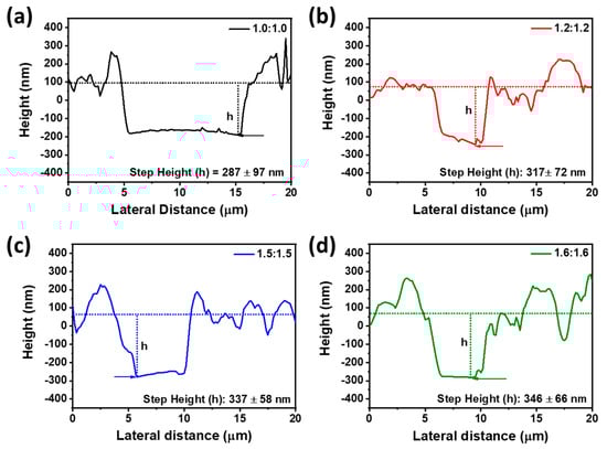 The thickness profile of the films is shown in Figure 3, measured using atomic force microscopy (AFM). The nominal film thickness h for the (1.0:1.0), (1.2:1.2), (1.5:1.5), and (1.6:1.6) formulations was measured to be 287 ± 97 nm < 317 ± 72 nm < 337 ± 58 nm < 346 ± 66 nm, respectively. The uncertainty values associated with each thickness (formulation) represent the average roughness (Ravg) acquired from the AFM, and a slight trending toward increasing nominal thickness was observed as the molar ratio was increased, despite the wide variability in Ravg, not uncommon for spin-coated perovskite films. The slight increase in the average thickness with increasing concentration may be linked to the associated increase in viscosity since the spin coating parameters remained fixed.