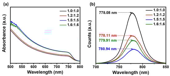 (a) The UV–vis spectra gathered for MAPbI3 perovskite films synthesized on c-TiO2/FTO/glass substrates. (b) The PL spectra of the perovskite films fabricated on c-TiO2/FTO/glass substrates, showing the maximum PL quenching for the (1.5:1.5) formulation, with the peaks largely centered around 778 nm.