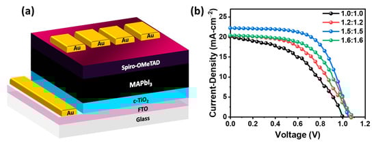 PSCs with all four formulations were fabricated based on the n-i-p architecture (Au/Spiro-OMeTAD/MAPbI3/c-TiO2/FTO), as shown by the device schematic in Figure 5a, and their recorded current density versus voltage (J-V) characteristics are shown in Figure 5b. The (1.5:1.5) PSC exhibited a maximum PCE of 14.56% among all formulations along with an open-circuit voltage VOC of ~1.05 V, short-circuit current density JSC of ~22.21 mA cm−2, fill-factor (FF) of ~62.58%, series resistance RS of ~8.82 Ω cm2, and shunt resistance RSh of ~3.49 kΩ cm2. On the other hand, for the (1.6:1.6), (1.2:1.2) and (1.0:1.0) formulations, PCE values of ~12.25%, 10.98%, and 9.32% were measured, respectively. The photovoltaic parameters for all PSCs are summarized in Table 2. While there is scope to improve these parameters further, the PCE trend: (1.5:1.5) > (1.6:1.6) > (1.2:1.2) > (1.0:1.0), lies in good agreement with the absorption and PL spectra.