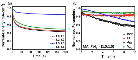 (a) The stabilized current output of PSC devices at 0.6 V for 3 min, and (b) the evolution of PV parameters with respect to time when the (1.5:1.5) PSC device was held at its maximum power point.