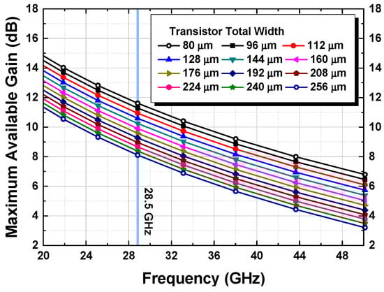 The RFCMOS transistors used in this study had a gate length of 65 nm with a maximum of 32 fingers. The gate lengths of the transistors used in this study are all 65 nm. The transistor size was adjusted by changing the width of the unit finger, total number of fingers, and multiplier. Figure 1 shows the maximum available gain (MAG) according to the transistor size at 350 mV gate bias voltage. As the gate width changes from 80 μm to 256 μm, the single-stage MAG ranges between 8 and 11.5 dB at 28.5 GHz.