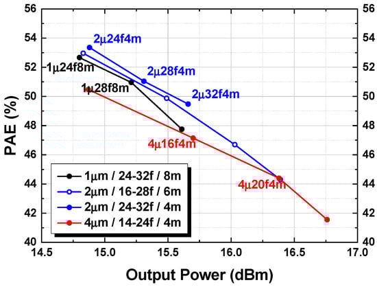 To determine the size of the transistor unit cell and the power stage, simulation of the output power, PAE, and load-pull of the unit amplifier was conducted; moreover, electromagnetic (EM) simulations of the transistor connections in the multiplier were also conducted. As seen in Figure 2, the output power increases with an increase in transistor size. However, PAE decreases, indicating inefficiency in further increasing the transistor size to achieve increased output power. Therefore, it is important to determine the (i) size of the transistor unit cell of the power stage, (ii) target output power, and (iii) the PAE to determine the appropriate transistor size. Particularly, to determine the size of the transistor, we must first determine the finger width, number of fingers, and multiplier size; however, the performance differs in each case due to parasitics, as shown in Figure 2. For example, the smaller the finger width, the smaller is the parasitic gate resistance inside the transistor; therefore, the 4 μm finger width (red line) has a much lower PAE. For 1 μm finger width (black line), many multipliers must be used to achieve high power, which results in lower PAE owing to the parasitic component in the power cell layout. Thus, we used unit cell transistors in the power stage with a 2 μm finger width in this study. Additionally, 32 fingers and 4 multipliers (total gate width: 256 μm) were used to achieve the target output power of 15 dBm with margin. In this study, we designed a three-stage PA with transistor gate widths of 144, 192, and 256 μm for each stage with a MAG of 10.5, 9.5, and 8 dB, respectively, and an expected total gain of 28 dB.