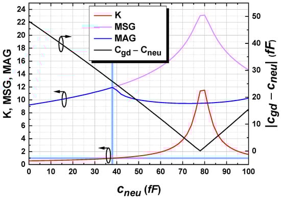 To conveniently determine K, a series parasitic resistance of the gate was equivalent to a parallel parasitic resistance, gg, to satisfy the condition in Equation (10). The simulation results of K, MSG, and MAG, based on the values of Cneu in a single-stage differential PA at 28 GHz, are shown in Figure 5. As | Cgd − Cneu | decreases, K and MSG increase with smaller denominators and achieve the highest value when Cgd and Cneu are equal. Thus, adjusting the Cneu can deliver additional gain and stability in the PA. Consequently, although the oscillation risk is particularly high in the high-gain three-stage PA, this can be solved by analyzing the parasitic capacitance of the transistors and the subsequent optimization of capacitive neutralization.
