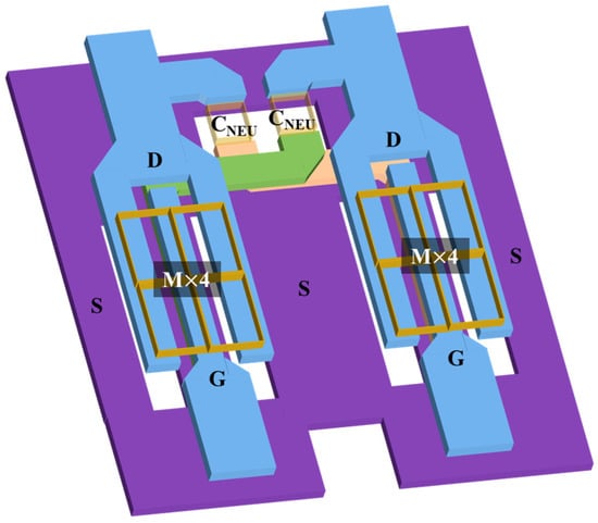Figure 6 shows the power cell layout of the designed PA, comprising of wide and long metal lines for interconnections, which generate various parasitic resistances, inductances, and capacitances. EM simulation was performed to consider the parasitic components of the power cell through the layout shown in Figure 6. Considering the interconnect lines and contacts, Cgd, Cgs, and Cds increase by 10%, to 7.7 fF, 19.9 fF, and 19.2 fF, respectively, which is sufficient to affect the overall performance of the PA.