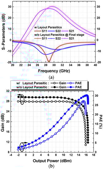 The difference in the estimations with and without EM simulations based on the results from Figure 6 is shown in Figure 7. Figure 7a shows that the operating frequency was downshifted due to the additional parasitic capacitance extracted from the EM simulation of the power cell layout; moreover, considering the parasitic components induced by the first and second stages would cause severe performance degradation in the power cell. As shown in Figure 7b, from the results of the continuous wave simulation at each center frequency (with parasitic components: 28 GHz and w/o parasitic components: 30 GHz), we can confirm that loss is mainly caused by the parasitic resistance. Consequently, the gain and saturation output power decreased by 2 dB and 0.5 dB, respectively, and PAE decreased by 3%. Additionally, considering these parasitic components affect the optimization values of Cneu and have a significant impact on stability or bandwidth, an accurate EM analysis is required. In this study, the target operating frequency is 28.5 GHz, so the PA is designed by considering the downshift induced by the parasitic components of the power cell.