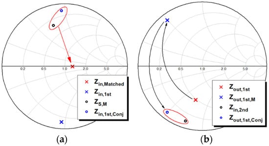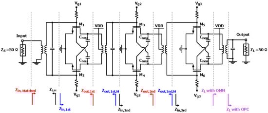 Figure 8 shows a schematic of the designed PA, which comprises a three-stage configuration, each stage consisting of a common source structure. The matching process at each stage is shown in Figure 9. The smith charts shown in Figure 9 were normalized to 50 Ω. Figure 9a shows the input and interstages matched with the conjugate to minimize loss during signal transmission. In the input matching network, ZS and input impedance of the first stage should match the conjugate. ZS,M should match ZS,1st,Conj as much as possible, through which, Zin,Matched is converted to 63.95 Ω close to 50 Ω. The input matching network was constructed considering the bandwidth rather than exact matching values. Figure 9b,c shows that the output impedances of the first and second stages are conjugate matched with the input impedance of the next stages through the inter-stage matching network. Finally, Figure 9d shows the process of matching ZL by obtaining the optimized output impedance ZOpt for maximum output power and PAE. Through load-pull simulation, ZOpt,Pout and ZOpt,PAE were found to be 13 + j8.9 Ω and 12.6 + j15.4 Ω, respectively. ZL is converted to 11 + j13.4 Ω through an output matching network (OMN) consisting of transformers and an output parallel capacitor (OPC). When the output impedance corresponds to ZOpt,Pout and ZOpt,PAE, the maximum output power and PAE are 15.4 dBm and 27.2%, respectively, and the expected values with 50 Ω load impedance are 15.3 dBm and 26.4%, respectively. The EM simulation was performed throughout the PA, including matching networks, transformers, pads, and connection lines between devices.