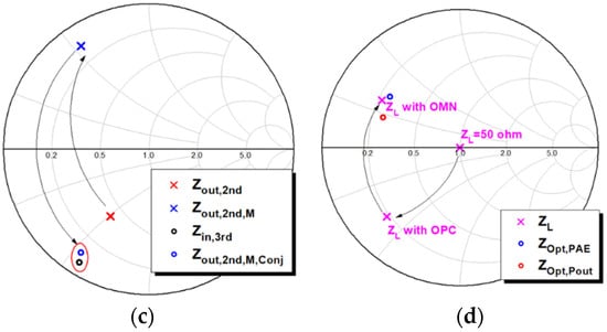 Simulation results of matching networks: (a) input conjugate matching, (b) conjugate matching for first and second stages, (c) conjugate matching for second and power stages, and (d) output matching for ZL with Zopt through load-pull simulation.
