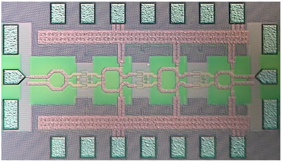 We designed a three-stage differential PA using a 65 nm RFCMOS, as seen in Figure 10 which shows a photograph of the designed PA. The total size of the PA, including the pads, was 0.90 × 0.50 mm2. and the core size of PA, excluding the pads and decoupling capacitors, was 0.74 × 0.16 mm2. The s-parameter and power of the designed PA was measured using Rohde-Schwarz ZNA43 vector network analyzer.