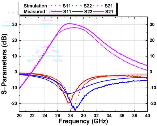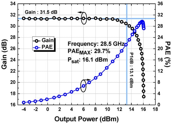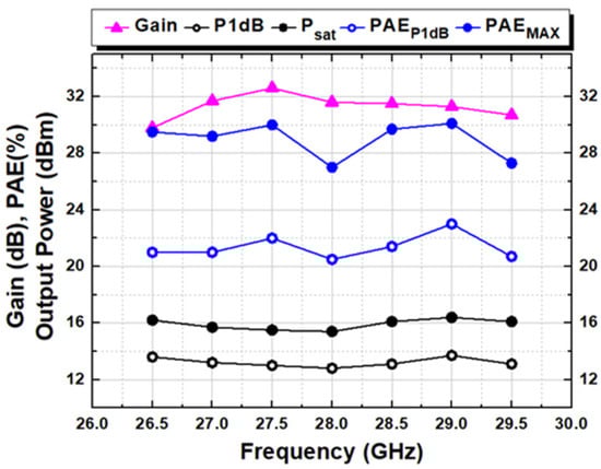 Figure 11 shows the S-parameter measurement results for the designed PA, which was measured in all three stages with a VDD of 1 V and gate bias voltages of 330/350/350 mV. The measured standby current of the PA was 47 mA, and the resulting current density of the transistor used was 40 μA/μm. From S21, the gain at 3 dB bandwidth is 4 GHz (26.5–30.4 GHz). The measured S11 and S22 were below −10 dB, ranging between 26.5–29.2 GHz and 26.8–32.2 GHz, respectively; the difference between the measurement and simulation results were due to variation in the process, and the two results were similar because of rigorous EM simulations. The measurement results of the CW signal under the specified bias conditions are shown in Figure 12. The PA has a saturated output power of 16.1 dBm at 28.5 GHz and 13.1 dBm at P1dB with a gain of 31.5 dB. The maximum PAE was 29.7%, whereas the PAE at P1dB was 22%. The measurement results of the CW signal are similar to that in the preceding chapter; however, it differs in current and gain due to variation in the process, resulting in a higher gain and PAE than that in the simulation. Figure 13 shows the measurement results of CW signals with frequencies ranging between 26.5–29.5 GHz. The maximum PAE of 30.1% was achieved at 29 GHz, over 27% in the higher bandwidths, and between 20.5–23% at P1dB. The output power P1dB ranged between 12.8–13.7 dBm, and the saturated output power ranges between 15.4–16.4 dBm.
