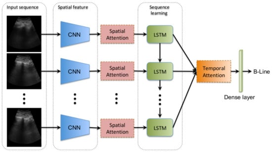 Contributions: In this paper, we propose a novel B-line classification and localization method for a lung ultrasound (LUS) video B-line recognition to address the aforementioned challenges. Our method uses a spatiotemporal attention mechanism that consists of a spatial component and a temporal component as shown in Figure 2. This work extends our previous work [11,12] on the temporal localization of B-lines. The novel contributions of this work are four-fold: (1) A spatial attention mechanism for B-line region detection; (2) A novel evaluation metric for B-line spatial localization; and (3) An investigation of the effect of different LUS video lengths on model performance during the training and testing phases; and finally, (4) we qualitatively and quantitatively show that our spatiotemporal attention is able to localize B-line regions and frames, despite being trained in a weakly-supervised manner.