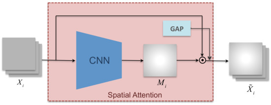 where ⊙ denotes element-wise multiplication; for , n is the number of frames, and each entry of M lies in [0, 1]. This operation attenuates certain regions of the feature map based on their estimated importance. Figure 4 illustrates the spatial attention mechanism.