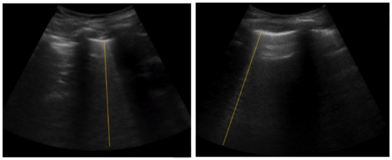 These anonymised LUS video clips were annotated by a qualified clinician using the VGG annotation tool [31]. During the annotation procedure, a label that is either B-line or non-B-line was assigned to each video clip. Then, the B-line frames in the B-line videos were annotated for the temporal localization task using the proposed temporal attention mechanism. Furthermore, the B-line regions were annotated using a straight line as shown in Figure 5 for the spatial localization task with our spatial attention mechanism. The annotation outputs were saved in Java Script Object Notation (JSON): https://www.json.org/ (accessed on 1 December 2021) format to be used as ground truth.