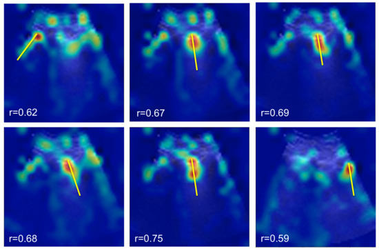 Examples of spatial attention map for B-line localization task. Our spatial attention module can automatically highlight B-line regions (red areas) and avoid irrelevant regions corresponding to no-B-line regions or background. Yellow straight lines represent ground truth. Correlation coefficient values (r) are presented at the bottom of each attention map.